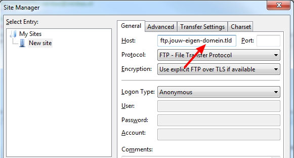- Vervolgens vul je bij de host in: ftp.jouw-eigen-domein.tld (let op: jouw-eigen-domein.tld vervang je dus met de domeinnaam waarnaar je verbindt).