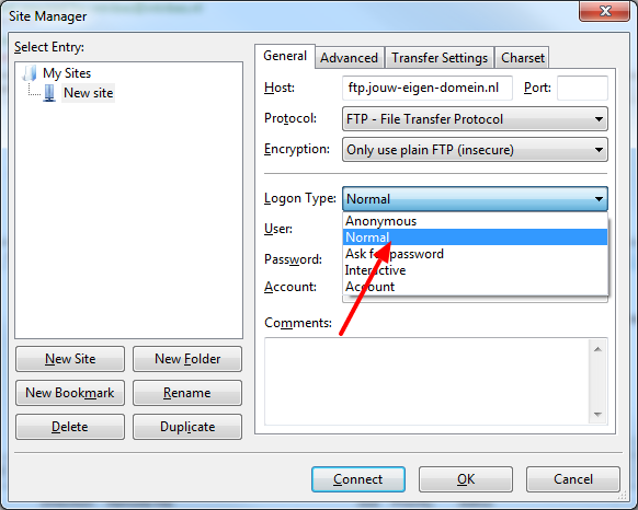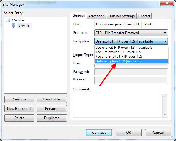Kies voor ‘Only use plain FTP (insecure)’ / Gebruik platte FTP (onveilig)