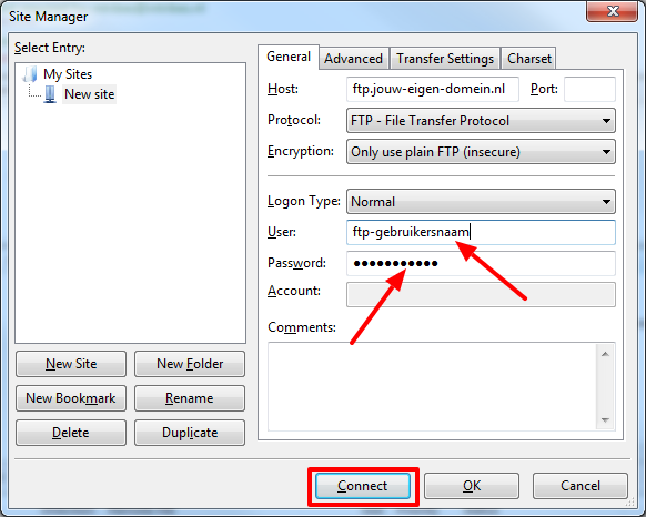 - Nu kun je je FTP-gebruikersnaam en wachtwoord ingeven. Vervolgens klik je op ‘Connect’ (verbinden).