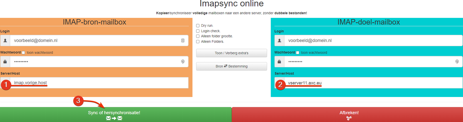 Hier vervang je voorbeeld@domein.nl met het over te zetten email adres. Bij password moet het wachtwoord om in te loggen in je email account. Op de plaats van 1. moet het IP adres of de host van je vorige hosting komen te staan. Deze waarde is dus afhankelijk van de vorige host en zal dan ook daar opgezocht moeten worden.