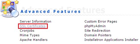 - Onder het kopje "Advanced Features" in het hoofdmenu van Directadmin klikt u op "SSL Certificates".