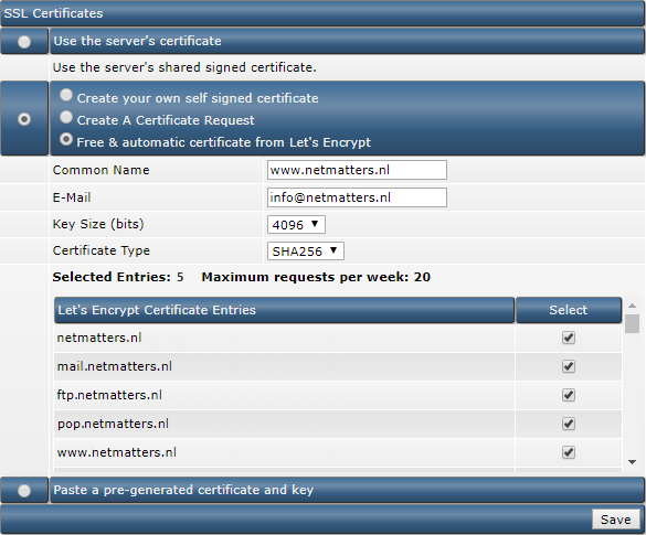 - Kies bij de opties Let's Encrypt Certificate Entries in ieder geval de volgende opties: